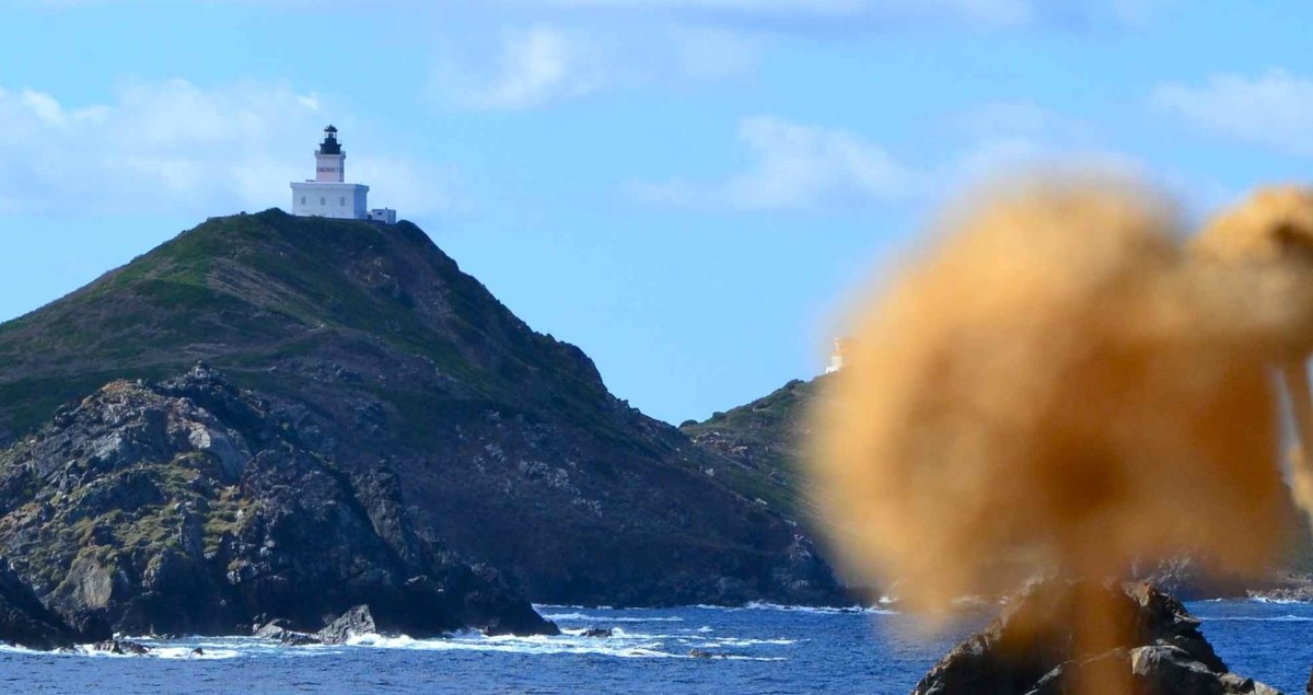 Widoczna w oddali latarnia morska wysp Sanguinaires. Decyzja o budowie latarni zapada w 1838 roku, trwa ona 6 lat i inauguracja latarni ma miejsce 1 grudnia 1844 roku. Wznosi się na 80 metrów a jej wieża mierzy ich 18. Niesie światło na 27 mil – błysk 0,1s, przerwa 3,9s, błysk 0,1s, przerwa 3,9s, błysk 0,1s, przerwa 6,9s. Wyspa, na której się znajduje jest długa na 1200 metrów i szeroka na 300. On voit de loin le phare des Îles Sanguinaires. La décision de la construction est prise en 1838, les travaux durent 6 ans et le phare est inauguré le 1er décembre 1844. Il s’élève à 80 mètres et sa tour mesure 18 mètres. Son feu porte à 27 milles avec des caractéristiques suivantes – éclat 0,1s, obscurité 3,9s, éclat 0,1s, obscurité 3,9s, éclat 0,1s, obscurité 6,9s. L’île sur laquelle se trouve le phare et longue de 1200 mètres et large de 300 mètres.