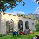 Dojeżdżam do Calenzany, gdzie mam zamiar dokupić kilka rzeczy do kolacji w sklepie Spar, w którym robiłem zakupy 10 lat wcześnej rozpoczynając GR20. Okazuje się jednak, że sklep ten jest całkowicie zamknięty. Jadę więc na pole namiotowe, gdzie jest również oficjalne schronisko GR20. Podjeżdżam, nie ma nikogo, podchodzę na recepcje, pani mnie informuje, że normalnie wszystko jest zamknięte, mówię, że przyjeżdzam z St Florent i że nie mam drugiej opcji. Ostatecznie mam zgodę na rozbicie namiotu. Po zainstalowaniu obozu, zostawiam rower i wybieram się pieszo do centrum Calenzany. Mijam początek szlaku GR20, restauracje, w której zjadłem posiłek dzień przed wyjściem na szlak. W centrum kupuję kawałek ciasta z boczkiem (quiche au lardon) i uzupełniam wodę.